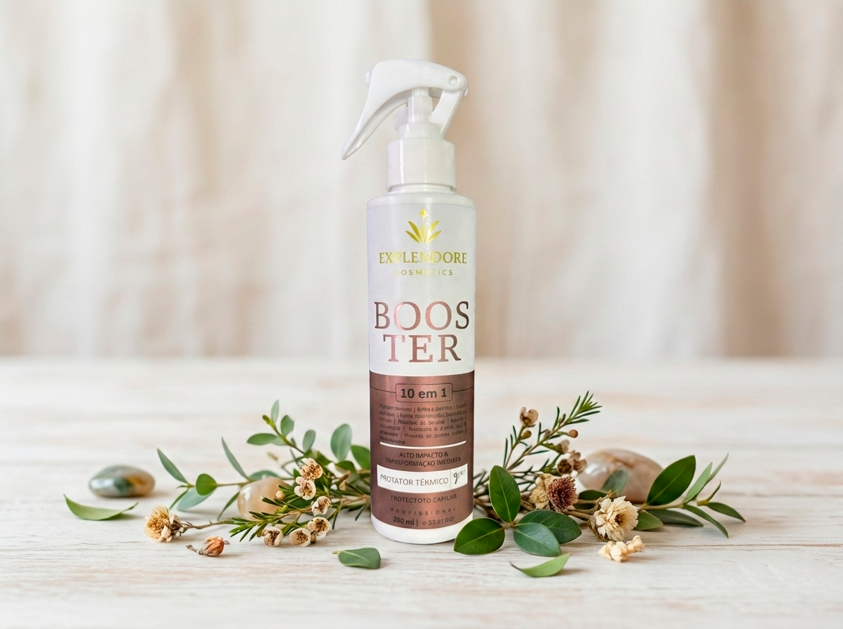 O Booster 10 em 1 da Explendore Cosmetics minimiza a aspereza dos fios, atribuindo flexibilidade e reposição de queratina, capazes de reduzir pontas bipartidas, e danificadas, iluminando fio a fio dos cabelos. Age na cutícula capilar repondo os aminioácidos perdidos no dia a dia, corrigindo a porosidade e potencializando o efeito da hidratação. Promove a resistência, elasticidade e crescimento aos fios, selando a cutícula, controlando o frizz e promovendo um brilho tridimensional.